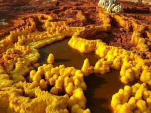 A geological depression caused by the continental drift of three tectonic plates, the Danakil Depression is one of Earth’s most unusual environments. Renowned as the ‘hottest place on the planet’ and home to salt lakes, lava lakes, volcanoes, and colorful acidic springs – it’s a wonderful, alien environment.